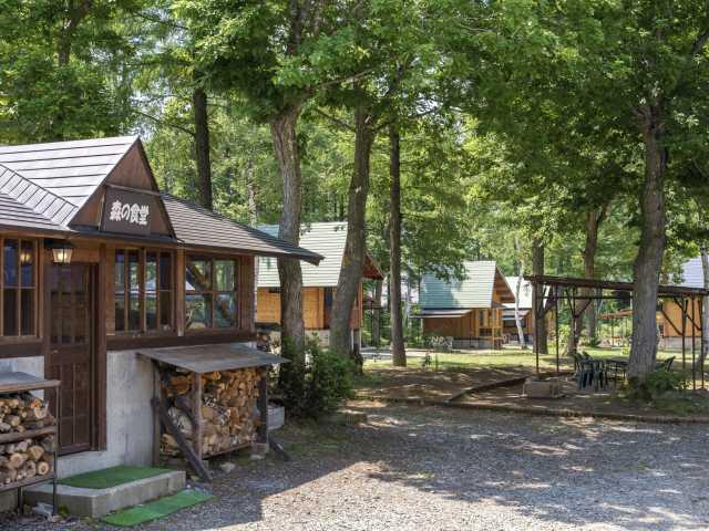 シラカバ林に囲まれた場内に、ファミリーロッジやコテージ、食堂、家族風呂などが揃う。「手ぶらキャンプ」は、テント設営済みのプライベートサイトで手軽にキャンプが楽しめ、オプションも豊富。
