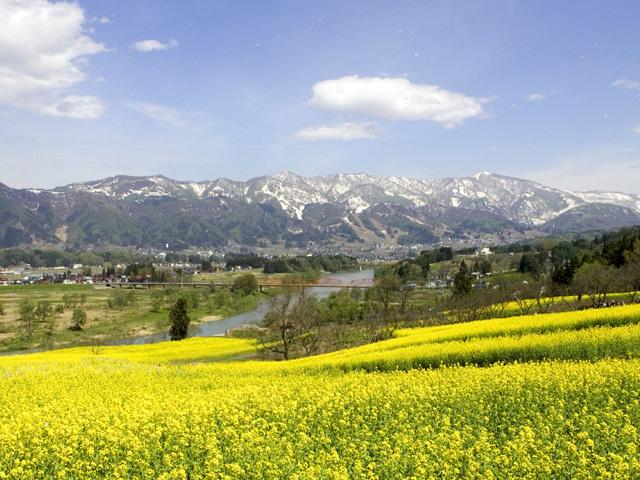 「菜の花畠に入り日うすれ~」の出だしで有名な『朧月夜』。その舞台となったのがこの公園。長野県のサンセットポイントにも選ばれている絶景の地だ。北信州の春を告げる菜の花が一面に咲き誇る5月頃と、ひまわりが元気いっぱい花開く8月頃に是非見に行きたい。