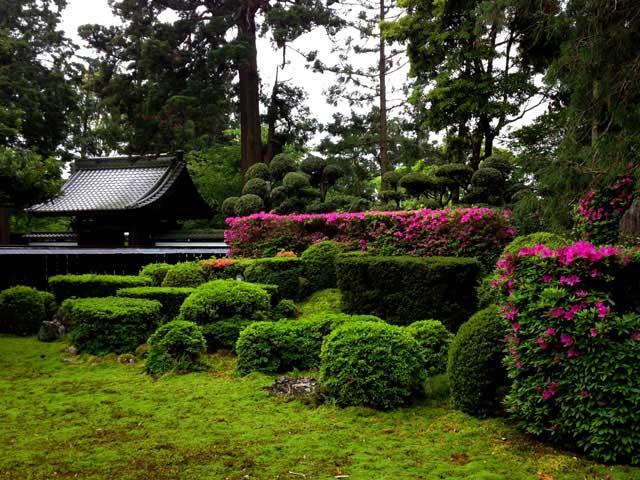 真言宗の寺。江戸時代初期に造園された約1000平方メートルもの枯山水の古庭園は、小堀遠州作といわれる。4月にはシャガが咲き、6月にはアジサイの花が境内中に咲き乱れる。