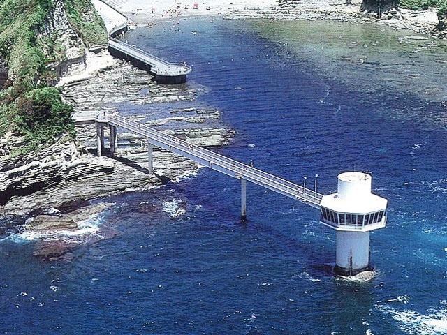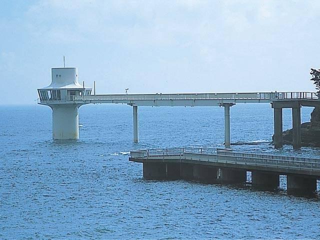 沖合60mに建つ海中展望塔。らせん階段を下りれば、窓から海中の生き物たちの生態が観察できる。暖流と寒流がぶつかる海域にあたるため、魚や海藻の種類も豊富だ。ときには大きなサメが見られることも。
