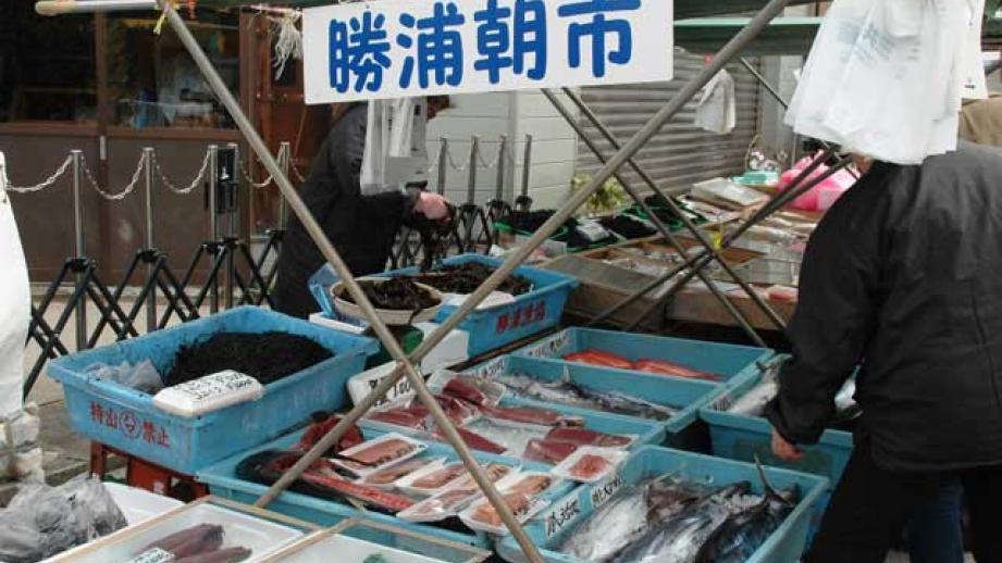 天正19(1591)年、勝浦城主・植村土佐守泰忠が市場を開いてから420年以上続いている勝浦朝市は、輪島・高山と並んで日本三大朝市といわれている。市が開かれる場所は交代制で毎月1~15日は下本町朝市通り、16日~月末は仲本町朝市通りで開催。
