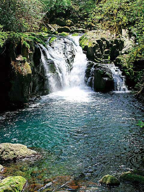 阿蘇くじゅう国立公園内に位置する渓谷。原生林に覆われた森林と阿蘇外輪山の伏流水が流れる渓谷が、みごとな景観を描いている。水は冷たく、夏は避暑地として最適。