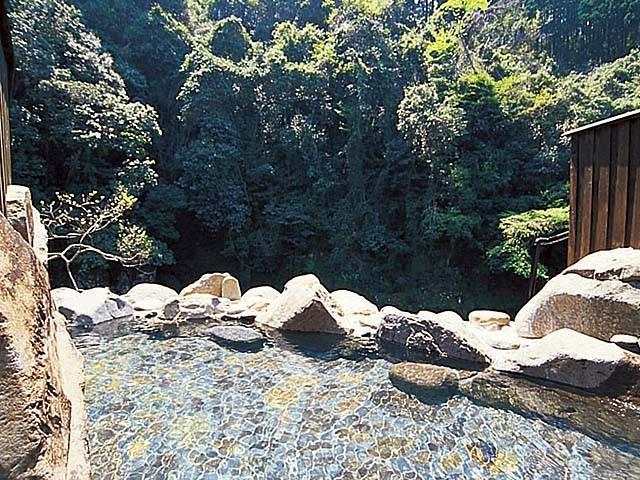 菊池渓谷の上流、菊池川沿いに湧く湯。自然に抱かれるように川沿いに宿がある。アルカリ性単純温泉の湯は、肌がツルツルになる美肌の湯として親しまれている。