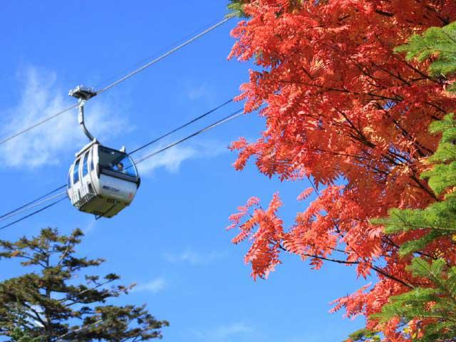 御嶽山の5合目から7合目にかかるロープウェイ。80基の6人乗りカプセル型のゴンドラは約20秒間隔で発着運行。秋の紅葉はもちろん、赤そばの花やコスモスが咲く季節もおすすめ。