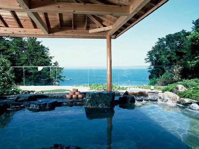 松の枝が広がり、磯の香りが漂う海辺の温泉では、効能豊かなさらりとした湯が堪能できる。海の見える露天風呂で一息つくのは、まさに極楽時間。