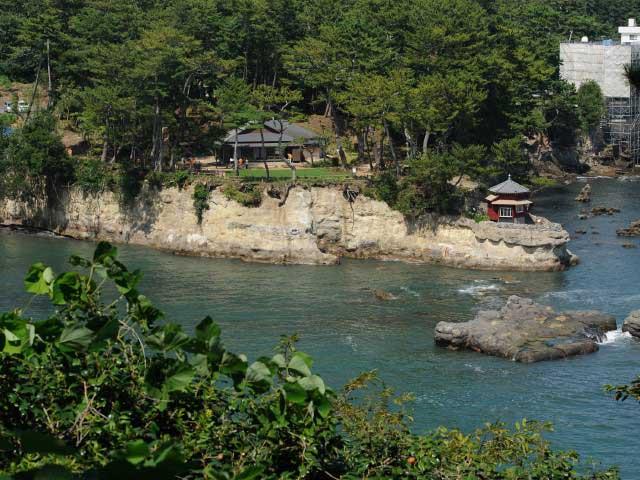 明治38(1905)年、岡倉天心の設計により建築。天心はこの建物を非常に気に入り、波の音を聞きながら過ごし、雨の日は窓から釣り糸を垂らしたともいわれる。東日本大震災の際に流されたが、平成24(2012)年に可能な限り、往時の姿に忠実に再建された。