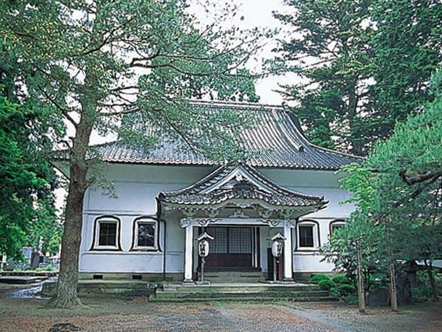 杉木立に囲まれて建つ土蔵造りの本堂は、白漆喰の壁と黒い瓦屋根のコントラストが美しい。明治13(1880)年の大火で旧本堂が焼失したのを受けて、明治29(1896)年に完成した。