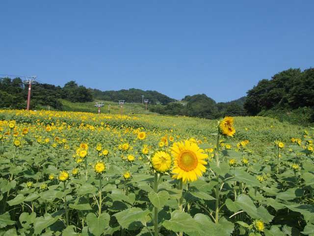 三ノ倉スキー場のゲレンデが、春から秋にかけて広大な花畑に。春は菜の花、夏はヒマワリ、秋はコスモスが咲く。