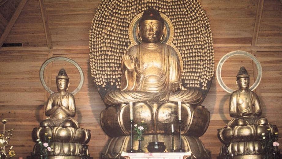 嘉禄3(1227)年建立の木造阿弥陀如来像で知られる浄土宗の古刹。阿弥陀仏の坐像は、千体仏を付けた舟形光背を背に、右に観音菩薩、左に勢至菩薩を脇侍として従え、金色に輝く。