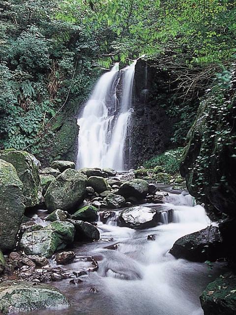 杵築市山香を流れる松尾川の上流、荒々しい岩肌から流れ落ちる滝で、落差は12mほど。滝の周辺は遊歩道が整備され、休憩所が設けられている。河川プールもある。