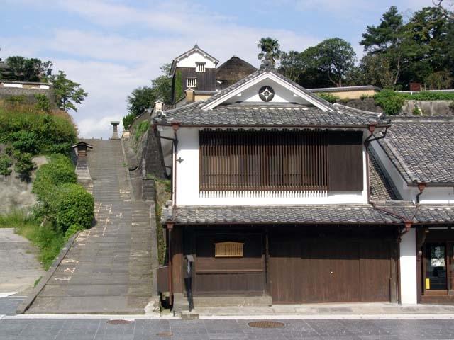 商家が連なる町と北台武家屋敷を繋ぐ酢屋の坂は、坂の下に酢屋があったことからこの名が付いた。扇形に広がる石畳の坂には灯篭が置かれ、夕暮れになると灯りがともる。坂の上から眺める石畳と土塀、商家が調和した風景は足が止まるほど美しい。
