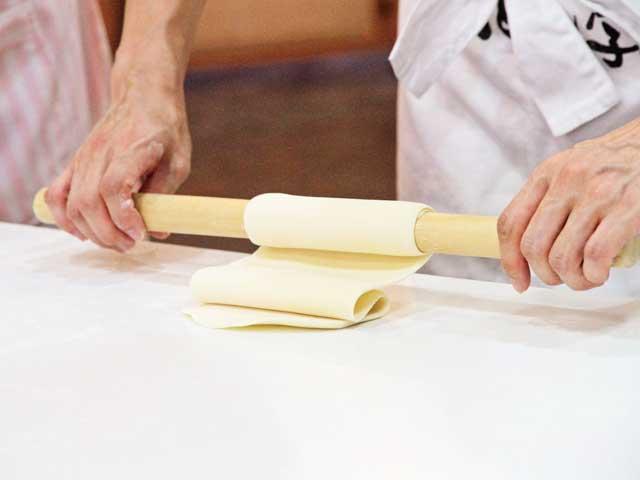 うどん作りのベテランの指導のもとでうどんをこねる作業から試食までのひと通りの工程を体験。所要時間は45分から1時間20分ほど。お持ち帰りもできる。