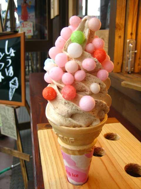 結婚式の引き出物や、嫁入り先でのあいさつ回りで配られる香川県の郷土菓子「おいり」を使ったキュートな見た目の「嫁入りおいりソフト」が人気。醤油と和三盆と希少糖ミルクから選べる。