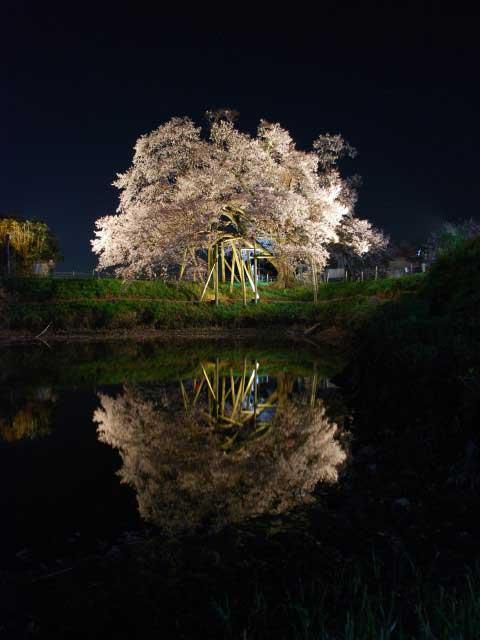樹齢約100年の堂々たる一本桜が池のほとりに立つ。見頃の時期には夜間のライトアップもあり、その姿を水面に映した「逆さ桜」が見もの。花密度が高く、淡いピンク色の花が隙間なく咲く。