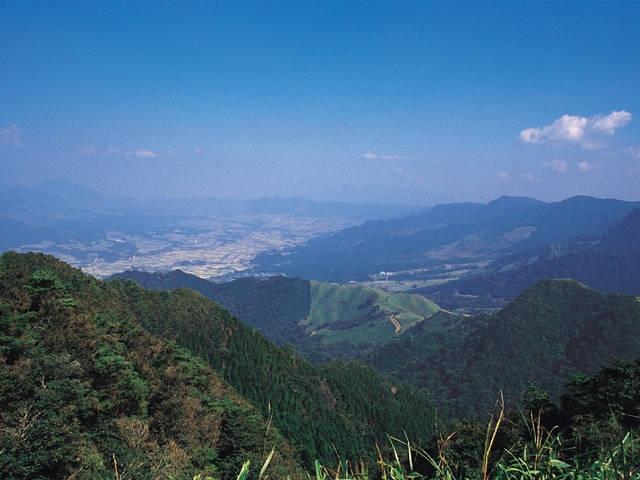 阿蘇の山並みが一望できる好展望の峠。中腹までは車で乗り入れることができ、徒歩15分ほどで標高約1100mの展望所へ到着する。一帯は、夏は深緑、秋は紅葉に染まる。