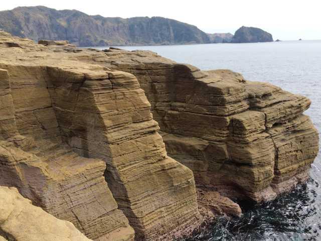 入間の西に続く荒々しい海岸の先端部、三ッ石岬の一角にある広大な岩畳。陸路があるが、漁船の磯渡しによる釣り人天国。岩畳は平板で、海上ピクニック気分が爽快だ。