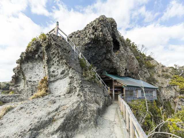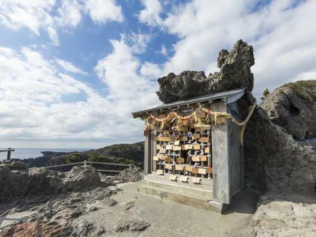 伊豆半島の最南端に位置する石廊崎の石室神社の、さらに先にある断崖絶壁にある神社。縁結びの御利益があるといわれている。