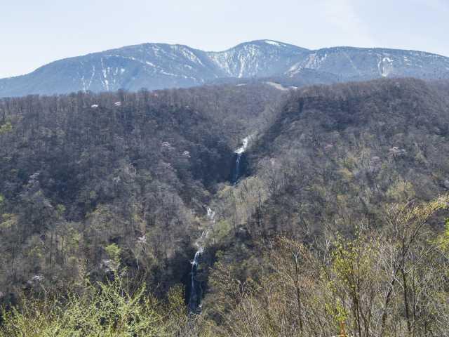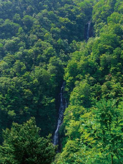三階滝、不動滝、地蔵滝という3つの滝を遠望できるスポット。3段に凹凸を成す断崖を水流が落ちていく三階滝は、繊細で優雅な眺め。不動滝は水量も豊富で迫力ある姿だ。