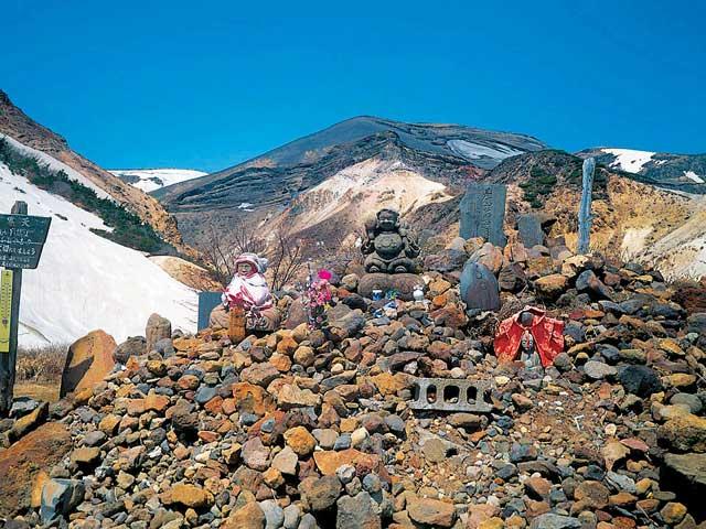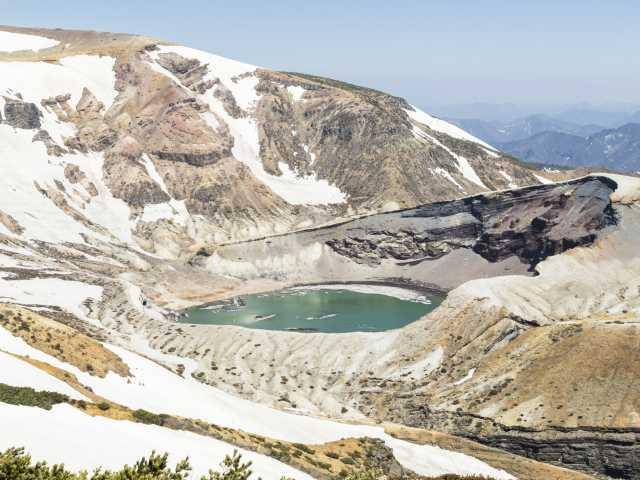 蔵王連峰を代表する山のひとつで、標高は1758m。刈田岳・熊野岳・五色岳の3峰に抱かれるようにエメラルドグリーンの湖水を湛える「御釜」は、蔵王のシンボルとして有名。