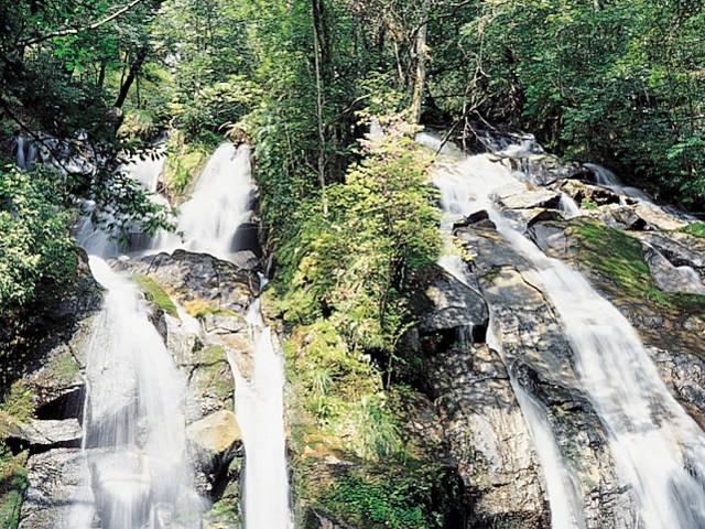 日本の滝100選の一つに数えられる名瀑。金引山の岩肌を滑るように落ちる数本の滝で、幅は約20m、高さは約40m。滝壺近くには不動堂が立つ。7月最終日曜日には金引の滝祭りを開催。