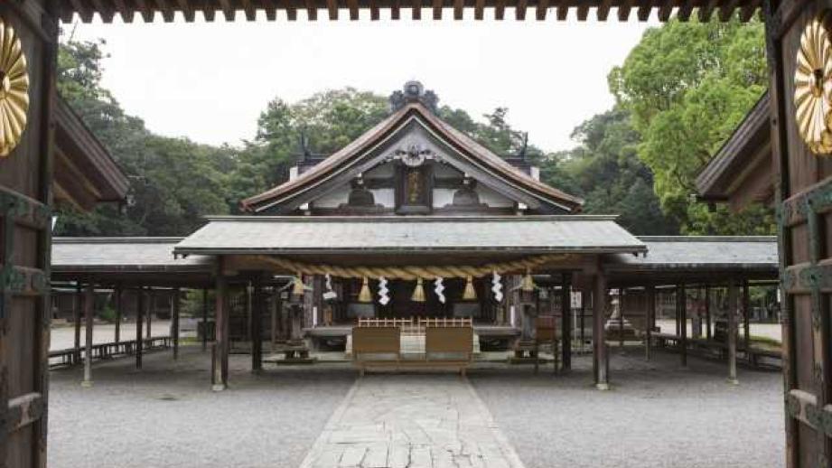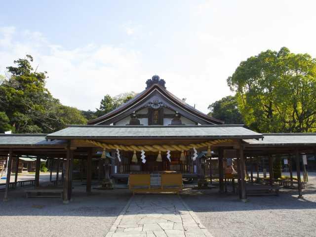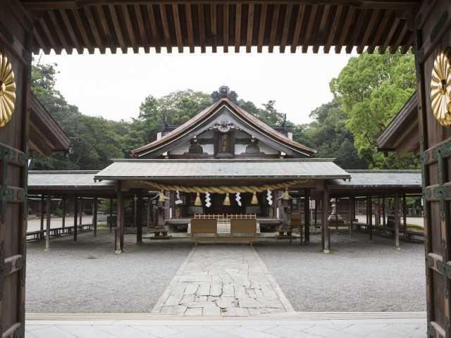 宗像市内を流れる釣川のそばに鎮座する総社。およそ10万平方メートルの広大な神苑に、本殿、儀式殿、祈願殿、神宝館などがあり、一年を通して多くの参拝者でにぎわう。本殿の横には御神木で、樹齢550年のナラの木が立つ。平成29(2017)年に世界文化遺産に登録。