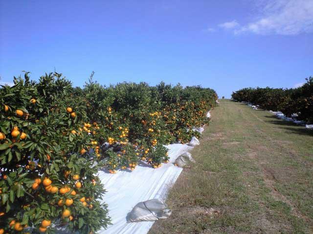 シーズンにはミカン狩りを楽しむ人でにぎわう。シートマルチ栽培の温州ミカンは甘さと酸味のバランスがよく、味が濃い。駐車場は見晴らしのよい山頂にある。入園料を払えば、園内は食べ放題。