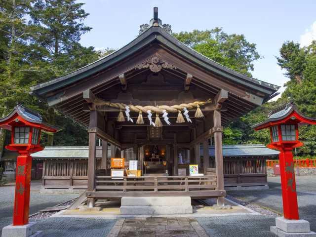 九州本土の沖合10kmにある福岡県最大の島「大島」の南西岸に、辺津宮と向かい合うようにして鎮座。60段の階段を上がると本殿、拝殿、御神木のイチョウの木などがある。日本における七夕伝説発祥の地といわれ、旧暦の7月7日に七夕祭が開催される。平成29(2017)年に世界文化遺産に登録。