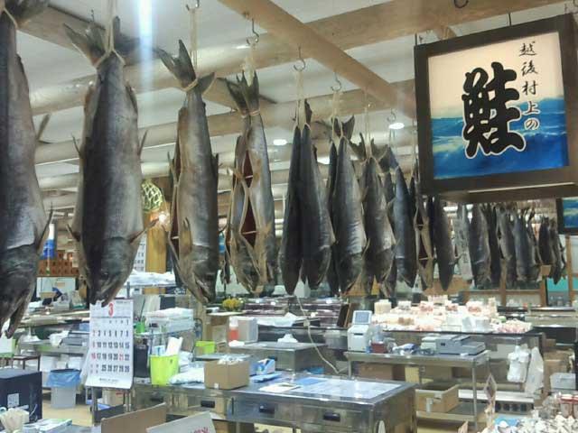 1階には地元岩船漁港に揚がった鮮魚が、種類も豊富に並ぶ。おすすめは、秋になると登場する新潟名物の塩引鮭だ。2階には海の幸が堪能できる食事処がある。
