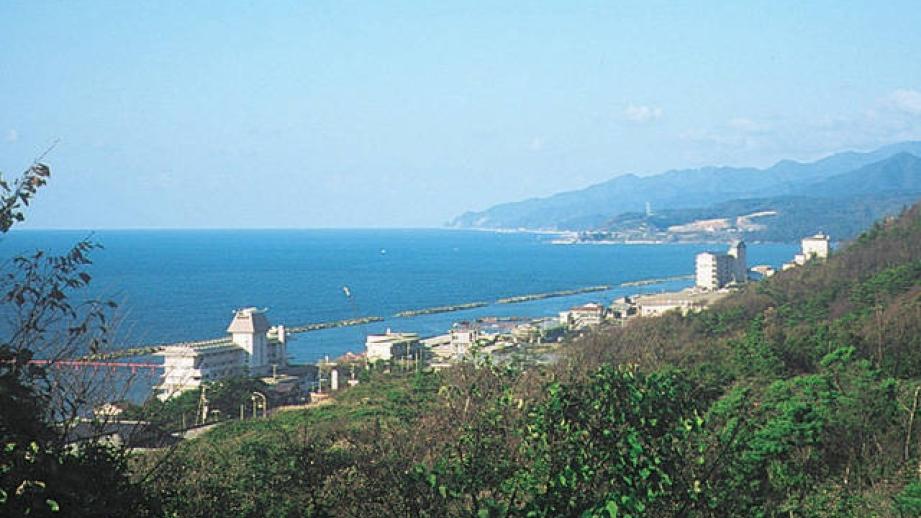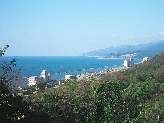 青々とした海が広がる瀬波海岸沿いと山沿いに宿が並ぶ。明治37(1904)年の石油採掘時に発見され、高温で新潟県有数の湯量を誇り、100余年の歴史を持つ。