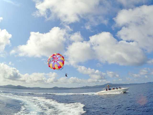 バナナボート、トーイングチューブ、スーパーマーブルが一度に楽しめるアクティブ3や、パラセーリングやマリンウォークが人気。