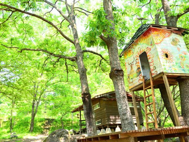 廃園寸前だった施設を、オーナーご夫妻がコツコツリノベーション。アニバーサリーケーキプレートなどサプライズのプランも用意された、優しさや温もりが詰まったキャンプ場。個性的な宿泊施設「森の小屋」が森の中に点在、ほかにもツリーハウスやカフェ、読書室などがあり、場内は絵本から飛び出してきたようなアートな雰囲気で満ち溢れている。