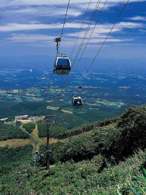 奥岳(標高950m)と薬師岳(標高1350m)を結ぶロープウェイ。薬師岳展望台からは安達太良山頂や阿武隈川、遠くは蔵王連峰までが一望できる。