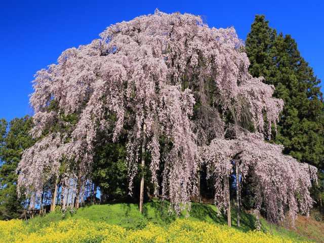 樹齢約150年、2本の木が寄り添い、滝が流れ落ちるように見事な花を咲かせる。手前に広がる菜の花とのコントラストが美しい。「大林の夫婦桜」とも呼ばれている。