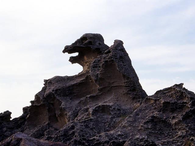 隆起した岩は、形といい、ゴツゴツした感じといい、ゴジラの横顔にそっくりな、男鹿の珍名所。夕焼けに浮かび上がるシルエットからは、今にも咆哮が聞こえそうだ。