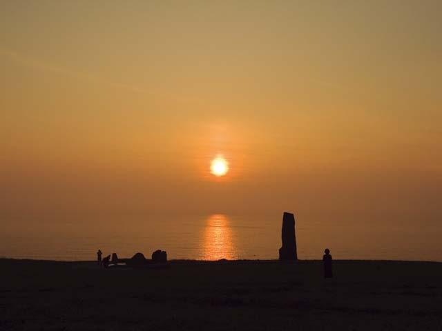 男鹿半島南部約1500mの海岸線は、干潮時には岩肌が露出するくらいの浅瀬が200mほど続き、夕暮時は夕日がとても美しい。