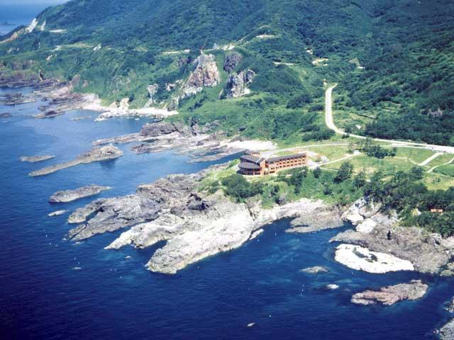 男性的な荒々しさを見せる海岸線と日本海に沈む夕陽が美しい、男鹿西海岸の断崖の上に眺望抜群の男鹿桜島リゾートHOTELきららかが一軒建つ。