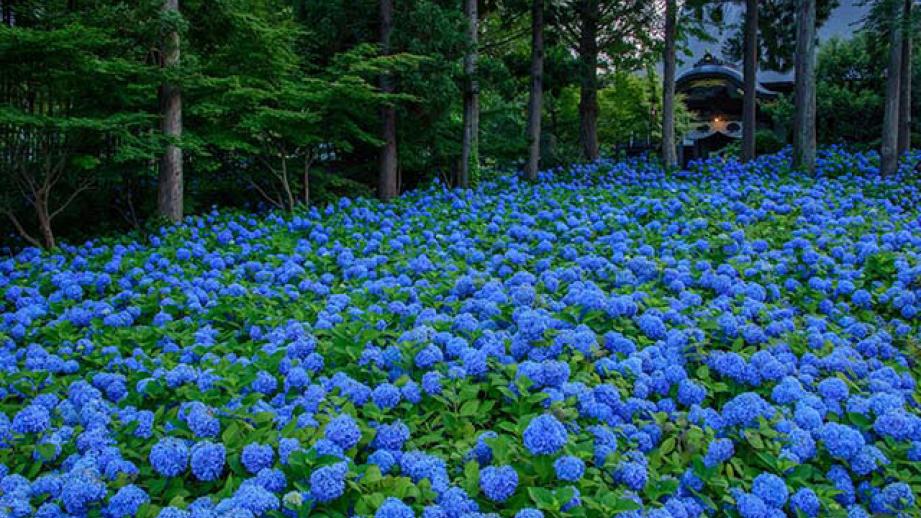 深い青色のあじさい約1500株が境内を埋め尽くすように咲き誇る「あじさい寺」として有名。両脇にあじさいが咲く参道や海を眺める見晴台からの眺めも美しい。