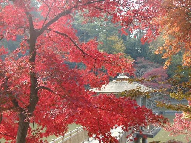 三つの大きな池があり、池と紅葉の組み合せは絶景。園内の動物園のふれあい広場にはウサギや珍しいミーアキャットなどの動物がいて、餌を与えたり、触れ合うことができる。