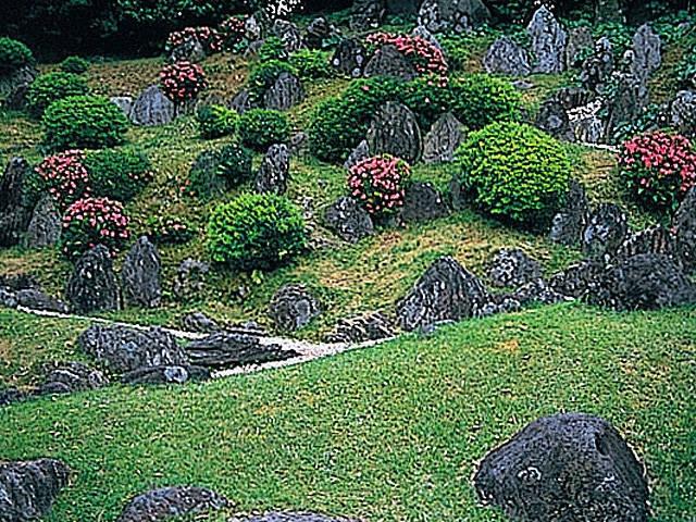 承応元(1652)年に四代藩主大村純長により創建。江戸初期様式で造られた枯山水の石庭は高さ8m、幅50mにおよぶ斜面を利用し、400個以上もの石を組み合わせている。
