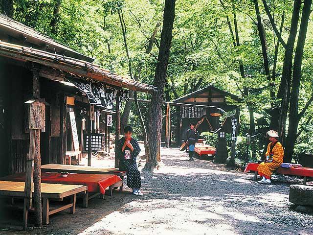 木枯し紋次郎と江戸時代をテーマにしたレジャー施設。おみやげを買うのも食事をするのも文銭を使用するので、まずは村の出入口にある関所で両替を。敷地内には火の見やぐら、水車小屋などがあり、江戸時代そのままの情景が再現されている。施設内には「怪異現洞」などの遊べる施設、小説『木枯し紋次郎』の生みの親、笹沢左保氏の全作品を展示する資料館もある。