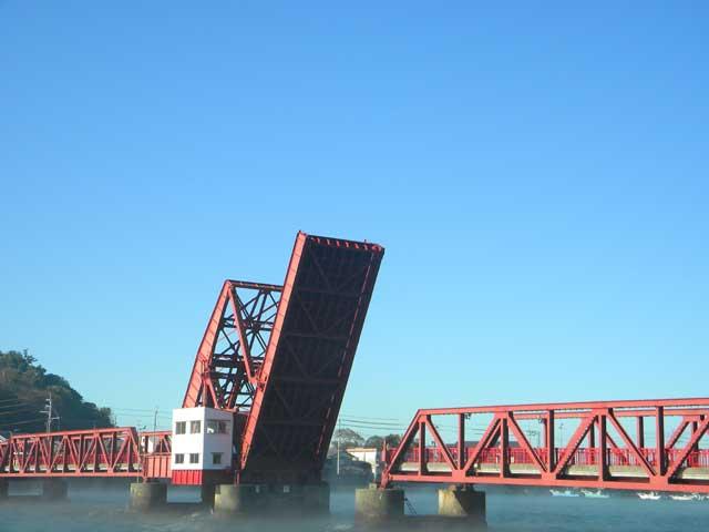 肱川河口にかかる、現在現役では日本最古の道路可動橋(開閉橋)。全長226mの赤い橋で、漁船が通るとき、ゆっくりと開いて船を迎え入れる。趣のある風景が楽しめる。