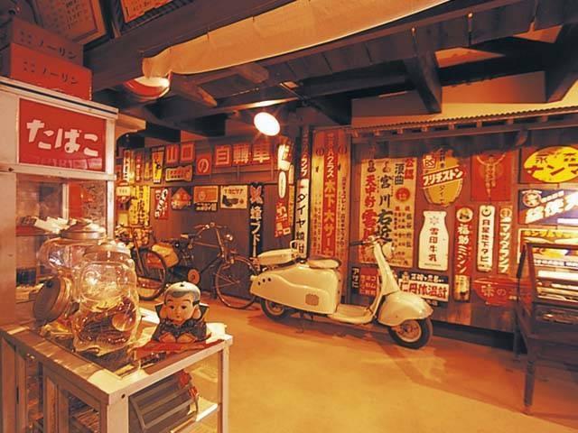 おおず赤煉瓦館東側にある展示倉庫。薬屋や床屋、民家などが軒を連ねる昭和30年代の街角を再現している。車やバイク、看板など当時の現物も展示品として並ぶ。