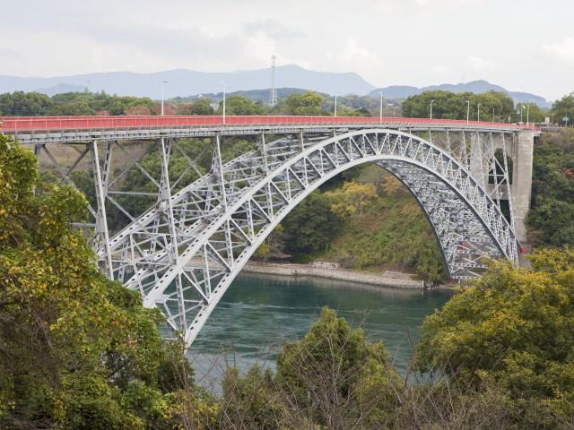 日本三大急潮として名高い伊ノ浦瀬戸をまたいで、佐世保市と西海市を結ぶ赤いアーチ橋。昭和30(1955)年に架橋され、全長316m、海からの高さはおよそ42mある。