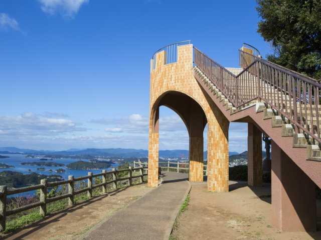 西海国立公園の九十九島全体が眺められる。標高約190mの石岳頂上にある石岳展望台は、眼下に美しい景色が広がる。映画『ラストサムライ』冒頭シーンの島々の風景は、ここから撮影されたもの。