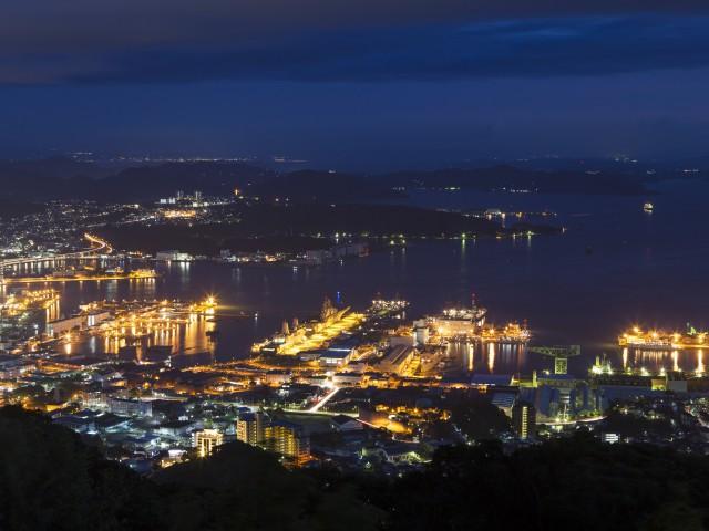 標高およそ360mの展望台。西に五島灘と九十九島の島々、南に佐世保港、東に市街地と三方に視界が開けている。昼間はもちろん、日本夜景遺産に選ばれた夜景もすばらしい。