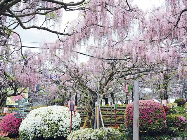 約3万平方メートルの広大な敷地に西日本一の規模を誇る約1200本の藤が咲く。ボタン桜やポピー、キンセンカ、ツツジ、デージーなどの花も楽しめる。