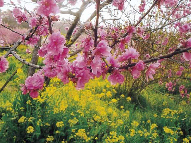 菊桃を筆頭に、照手姫や矢口桃、源平枝垂桃など多彩な桃の花が見られる。同時期には黄色い花をつけるレンギョウ約10万本が咲き、ピンクとの美しいコントラストが楽しめる。