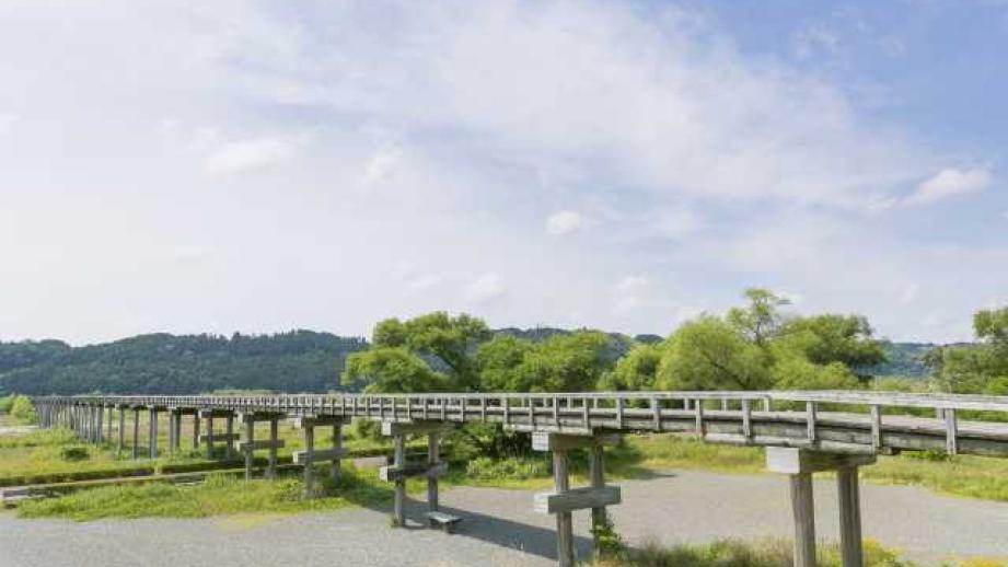 東海道一の大河・大井川の渡し場として発展した島田宿。川越しのための施設や町並みを復元・保存した大井川川越遺跡はぜひ訪れたい。大井川には木造の蓬莱橋が架かる。