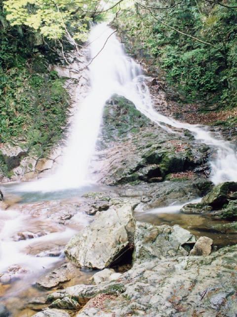 大鬼谷のブナや落葉樹が美しい遊歩道を歩くと、絹糸をたらしたような繊細な流れの雌滝が見えてくる。静かに水が流れ落ちる雌滝とは対照的に、迫力があるのが雄滝。