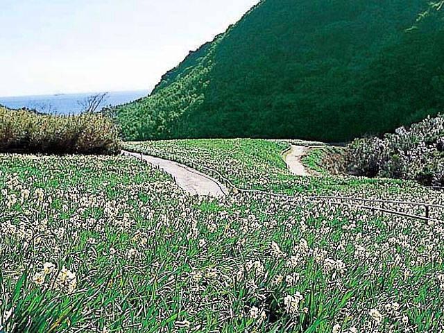 海を望む谷間のスイセン畑一面に可憐な花を咲かせる。早咲きは12月下旬頃でピークは1~2月、遅咲きは4月頃まで見られる。緑の斜面に淡い黄色が連なり、美しい風景を織り成す。